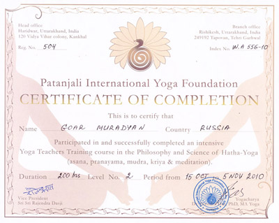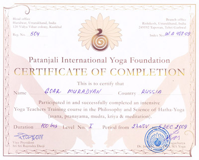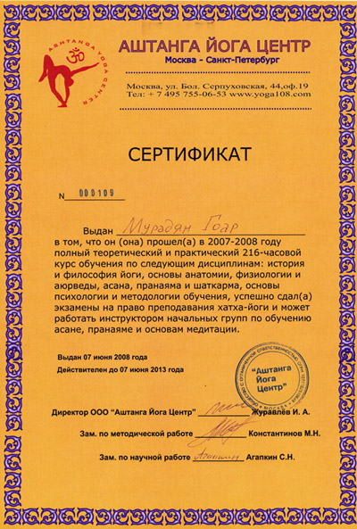 - 2008 – Курс по пранаяме (дыхательная техника, 4 звено – ступень Аштанга-йоги);